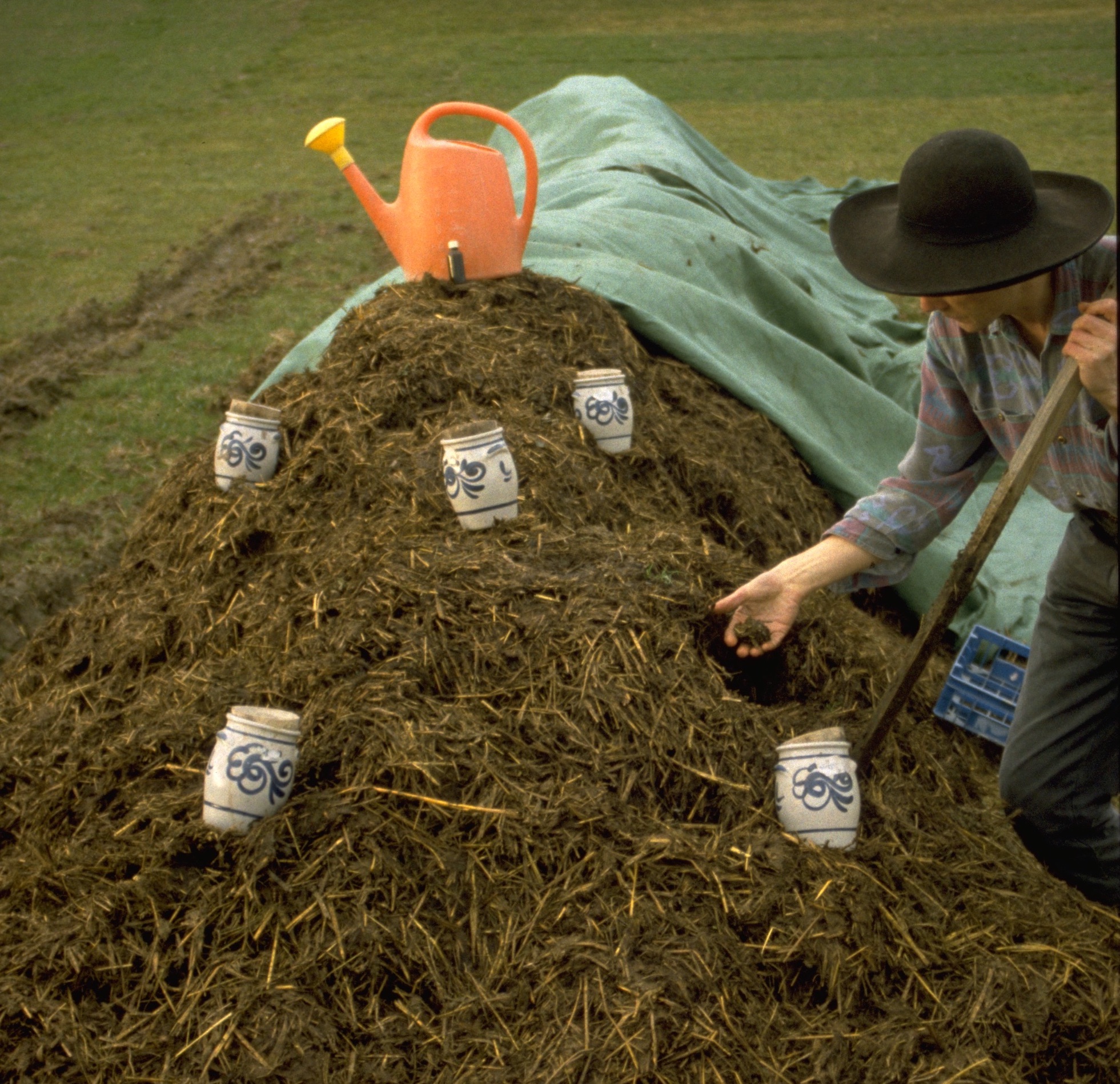 Zuletzt, vor dem Zudecken (hier mit dem grünen Vlies), wird mit warmem Wasser verrührtes Baldrianpräparat über den Misthaufen gespritzt.