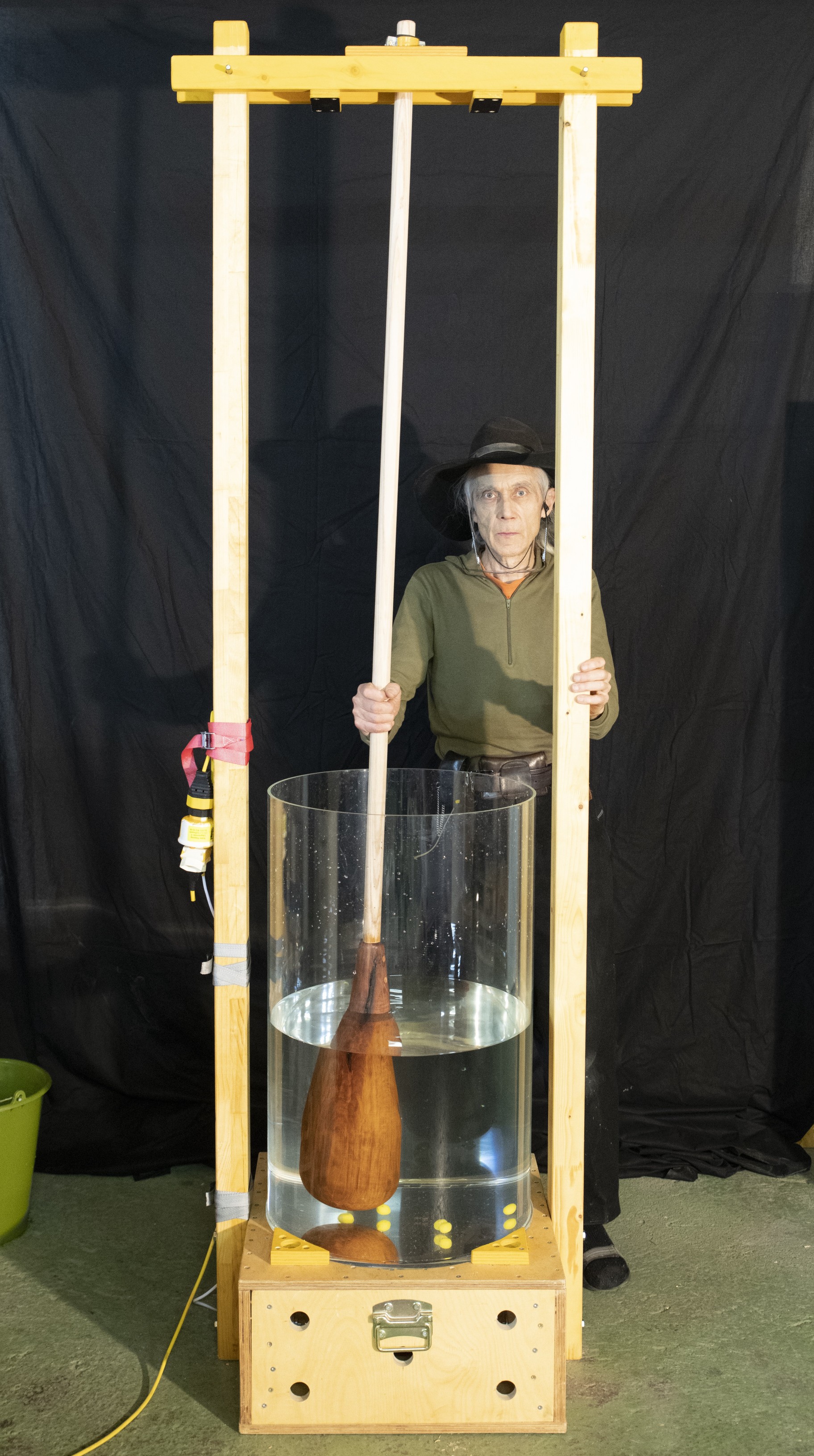 Im Video sowie im Bild unten sehen Sie die Rührvorrichtung mit dem aufgehängten Rührwerkzeug aus Birnenholz, gedrechselt von Drechslerei Meier, CH- 8634 Hombrechtikon